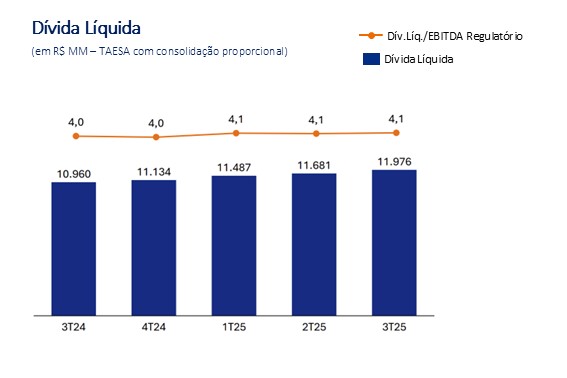 Considerando a dívida líquida proporcional das empresas controladas em conjunto e coligadas, a relação dívida líquida sobre EBITDA ficou em 4,1x no 3T25, em linha ao valor registrado no 2T25 (4,1x).